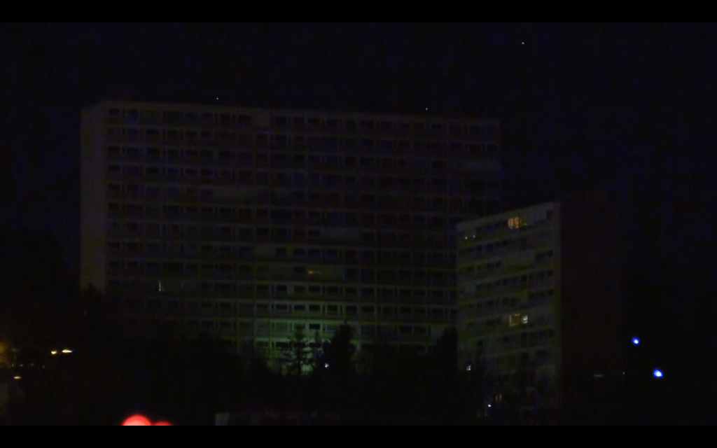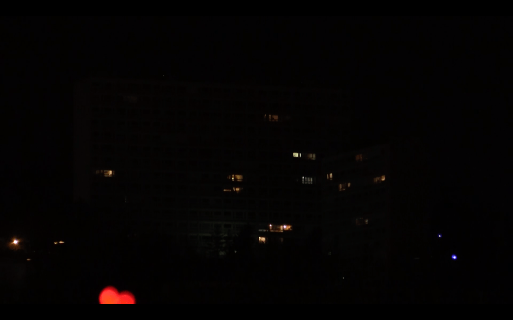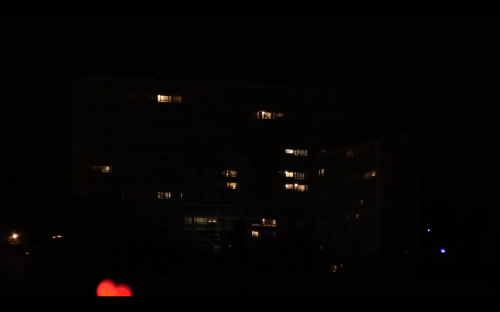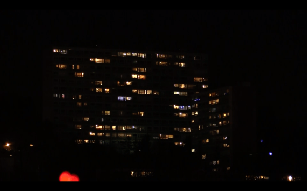 La deuxième vidéo, plus terre à terre, illustre la notion du temps si différente dans un rêve. Quelques minutes de rêve peuvent être ramenées à plusieurs heures d’absence. Pendant ce temps que se passe t-il par la fenêtre ? Les lumières de la nuit s’allument puis s’éteignent au rythmes des habitants et des habitudes. Les vidéos se complètent par leur contenu et s’opposent par leur réalisation : évoquant l’idée de deux univers.