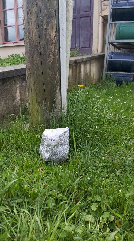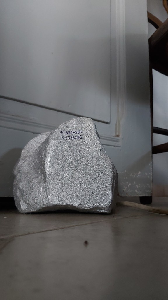 Ce sont des cailloux tout ce qu’il y a de plus banals, récupérés sur des lieux ayant une valeur artistique selon moi. Ils sont ensuite nettoyés, polis sur une face peints en argenté afin d’attirer l’oeil et de devenir « des trésors » dans le sens commun du terme. Dessus j’inscris les coordonnées polaires des lieux où je les ai trouvé, un peu comme une énigme incitant les gens à se questionner et peut être même à se rendre dans ces lieux.
