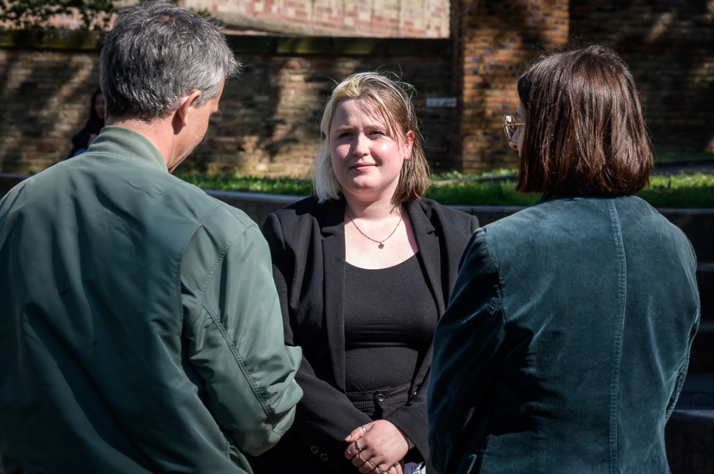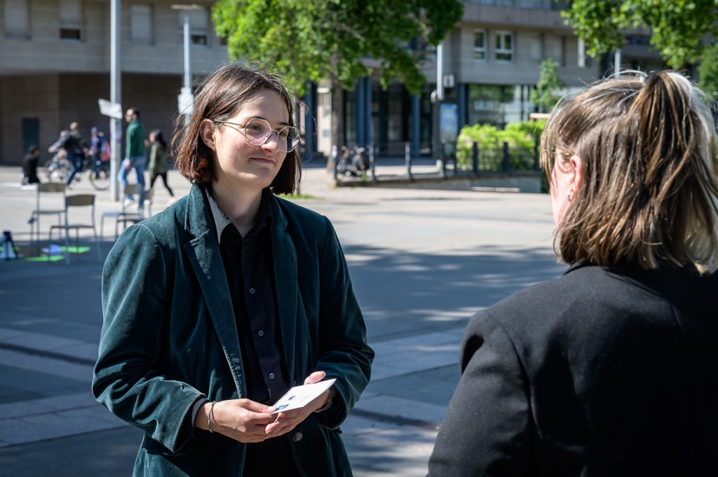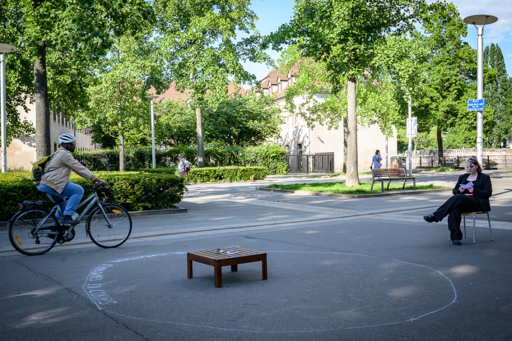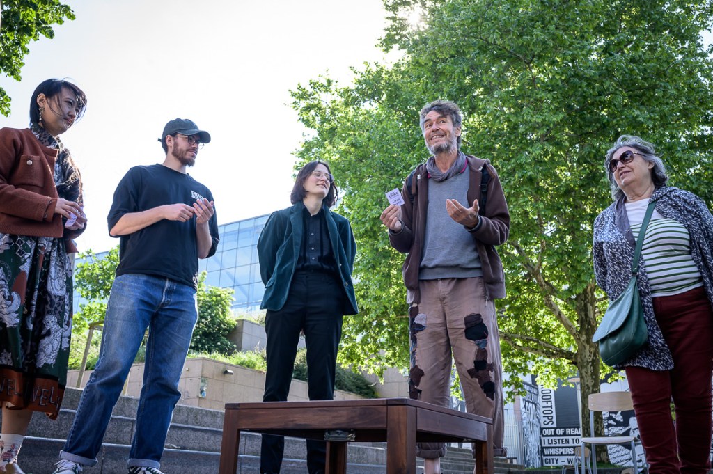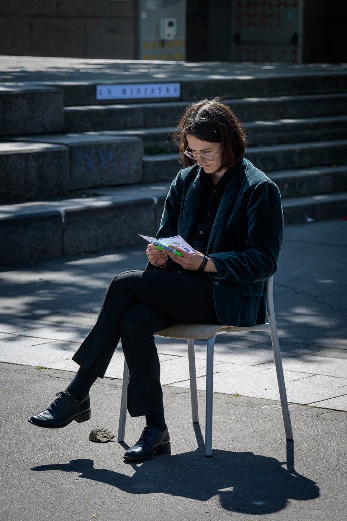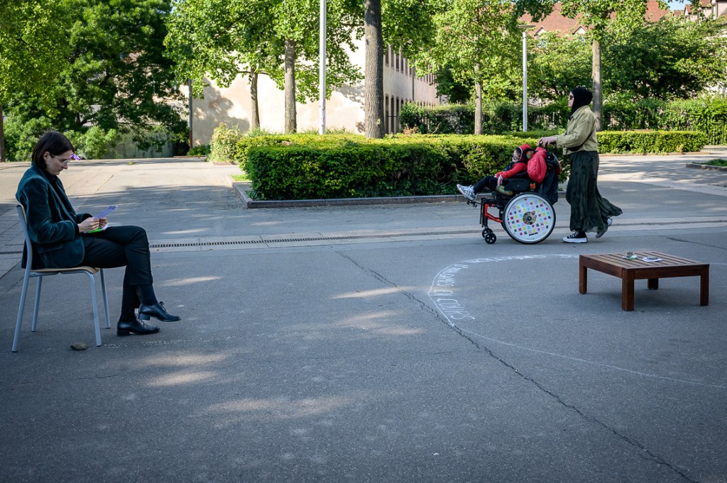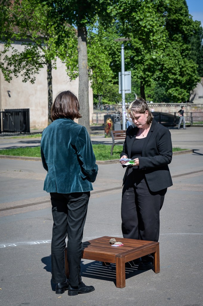 Après avoir pris le temps de se plonger dans leurs fiches, Margaux et Eva se rejoignent dans la zone délimitée pour une « réunion » où elles explorent ensemble l’amalgame tiré au sort avec la participation du public et des rôles associés. Ici, l’erreur devient créative, le malentendu, matière à débat.