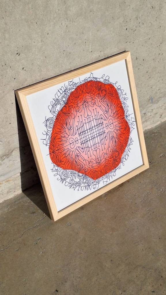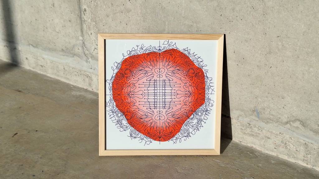 En bleu, on retrouve l’esquisse d’une pièce en métal à venir et en rouge la forme du Lac Pavin qui a inspiré cette pièce.